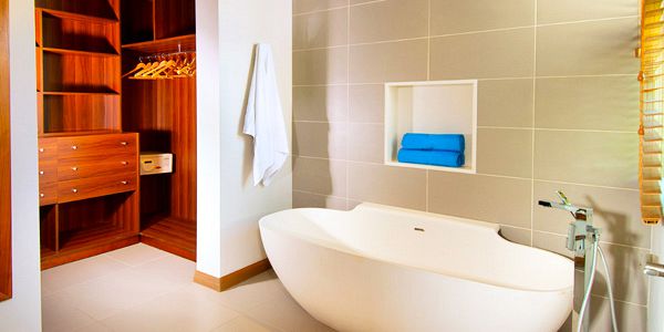 La chambre principale, qui a une vue imprenable sur le lagon, équipée d’un système de climatisation, comprend un grand lit à baldaquin, une salle de bains ensuite et un téléviseur à écran plat.